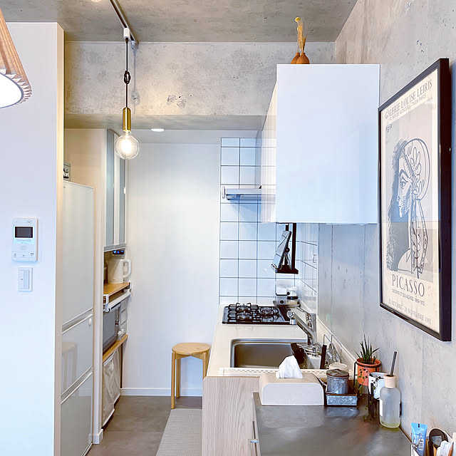 ダイニングで鏡と一緒に目を惹くアートは、MUUさんが祖父の家から引き継いだ思い出深い年代物。そのアートに導かれるように視線を向けていくと、壁付けキッチンへと自然に移行していきます。こうした、ゆるやかでスムーズなゾーニングもMUUさん宅の魅力のひとつではないでしょうか。ダイニングとの連携がとりやすいスタイルだったり、適宜切り替えられた壁の仕様がいい具合にインテリア性を高めていたり、機能性とデザイン性の見事な両立に感嘆します。