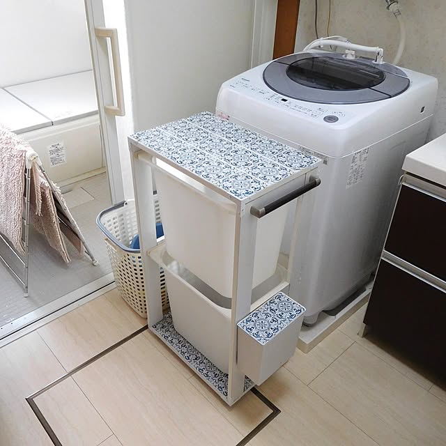 こちらはワゴンをDIYした実例です。IKEAのトロファストの収納BOXがスライド式で固定されているそう。天板には着替えを入れるカゴを置け、移動も楽でとても活躍しているそう。後から貼ったというブルーのタイル模様のマスキングテープが爽やかなアクセントになっています。