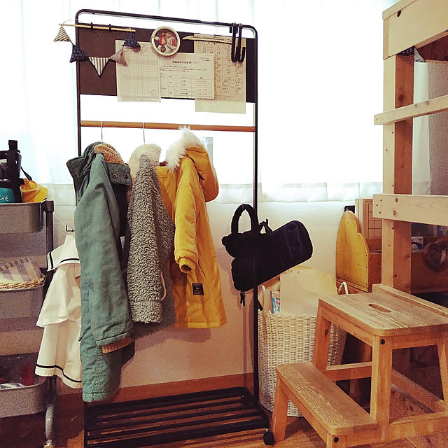 山崎実業のキッズパネル付きハンガーラックを購入されているのは、sawa.co.さんです。こちらのハンガーラックは、ハンガーバーの位置が低めの、お子さんに優しい逸品。上部にはパネルもついているので、ユーザーさんのように時間割などをつけておくと毎日の学校準備もしやすくなります。