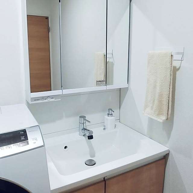 こちらのユーザーさんは、ニトリで購入したスリッパスタンドを洗面台横の壁に貼り付けて、タオル掛けとして使っています。タオルを掛けた際に、タオルと壁が離れて衛生的に保てるそうですよ。真っ白で清潔感のある洗面台まわりにマッチしたデザインで、もとがスリッパスタンドとは思えないほど、空間になじんでいますね。