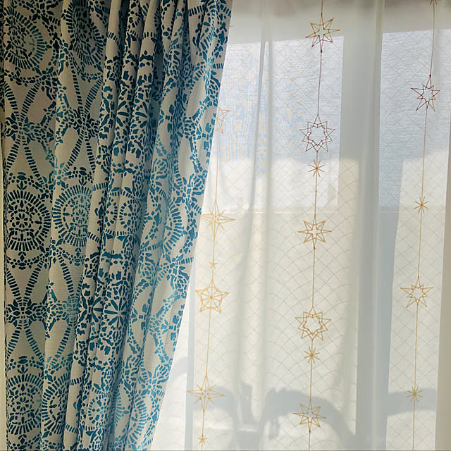 こちらのユーザーさんは、びっくりカーテンのモロッコシリーズを使用されています。壁紙を張り替えるのは大変ですが、カーテンなら取り替えも簡単。レースカーテンも幾何学模様の刺繍入りにすることで、異国情緒が漂います。ブルー×ゴールドの組み合わせは、イスラム圏の雰囲気を感じさせるおすすめのカラーリングです。