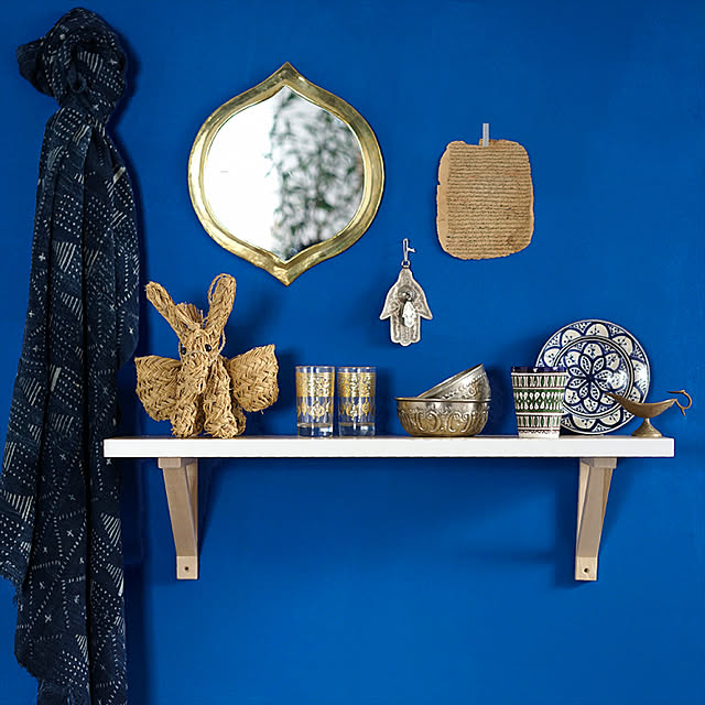シャウエンをイメージして、イマジンウォールペイントで壁を塗装したアイデアです。真っ青な背景を前に、ホワイトとゴールドのディスプレイが映えています。カラーを絞ることで、統一感のあるディスプレイになりますよ。