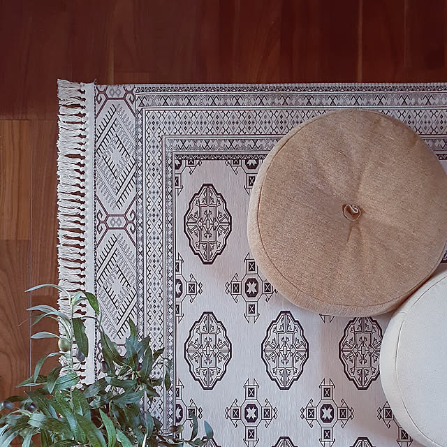四季物ひろばのトルクメン風洗えるラグに、荻原のインド綿ラウンドクッションを組み合わせたアイデアです。ホワイトやベージュカラーであれば、既存のインテリアにも合わせやすいですよ。民族っぽさを抑えたい場合は、形や柄でモロッコテイストを取り入れるのがおすすめです。