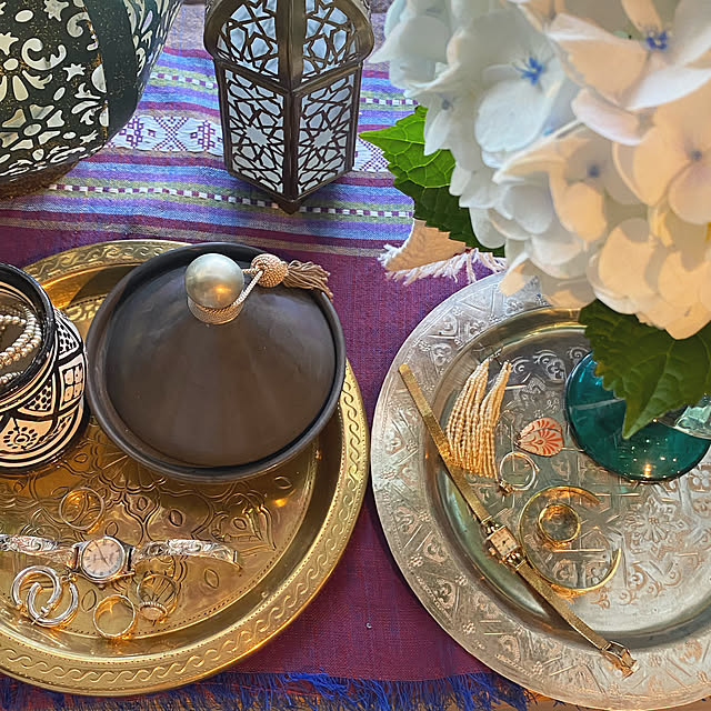 こちらのユーザーさんは、ピンクとパープルをメインカラーに、ゴールドを差し色にされています。モロッコでは装飾が施されたアルミのメタルトレイを、折りたためる木製脚に乗せたミニテーブルがよく使われます。トレイの色によっても雰囲気が変わるので、インテリアに応じてシルバーやゴールドを選んでみてください。