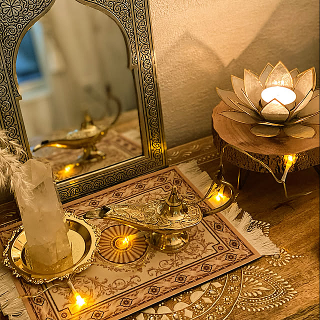 オージアーチがデザインされたミラー前に、ミニ絨毯とランプ、キャンドルを並べたアイデアです。幻想的な様子は、まるで小さな礼拝堂。小ぶりなアイテムを組み合わせて、モロッコのアラビアンテイストを上手に表現した実例です。