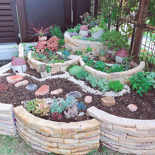 お庭の一画に、多肉植物の花壇を作っている実例です。高低差を付けた花壇に、たくさんの種類の多肉植物が植えられ、ユーザーさん手作りのお家が飾られています。思っていたより土も植物も足りず、大変だったそう。まるで小さな町のような花壇は、眺めているだけで癒されます。
