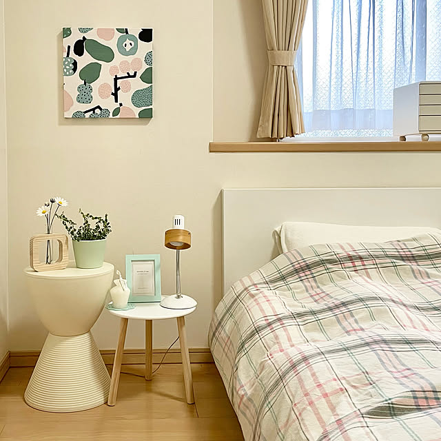 北欧インテリアでコーディネートされた、maryona3610さん宅の寝室。ベッド横のサイドテーブルに、観葉植物が飾られています。淡い色の植木鉢で、周りとの調和もバッチリですね。観葉植物の葉の動きが愛らしく感じられます♡