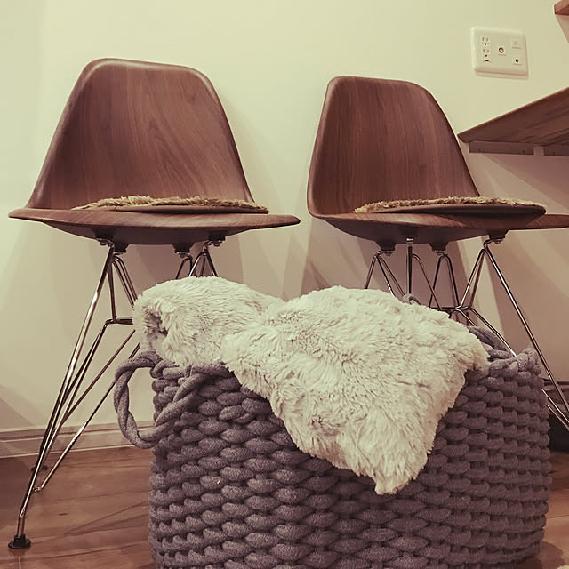 こちらはカインズのカゴをフロアに置いて毛布入れとして使っている実例です。置き場に困ることの多いブランケットも、これなら簡単に収納できますね。白い中身がグレーのカゴとよく合います。ぬくもりを感じる見た目も、ブラウンの椅子と相性抜群です。