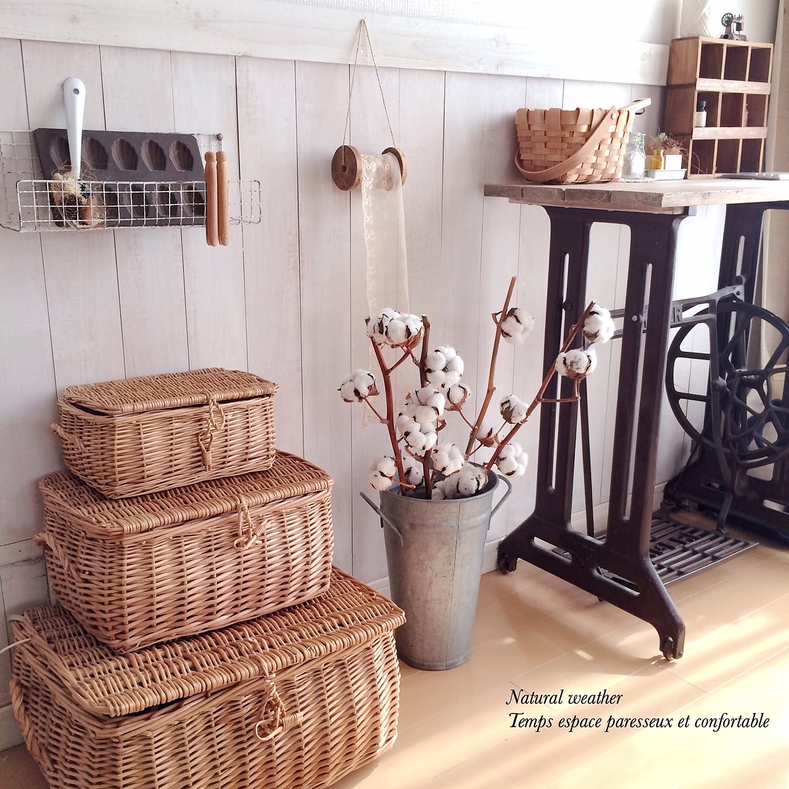 ブリキ缶に、コットンフラワーをディスプレイされたGeminiさんです。積み重ねられたかごや、アンティークなミシン台との組み合わせバランスがGood。細部まで統一感を感じるインテリアに、Geminiさんのセンスのよさを感じます。