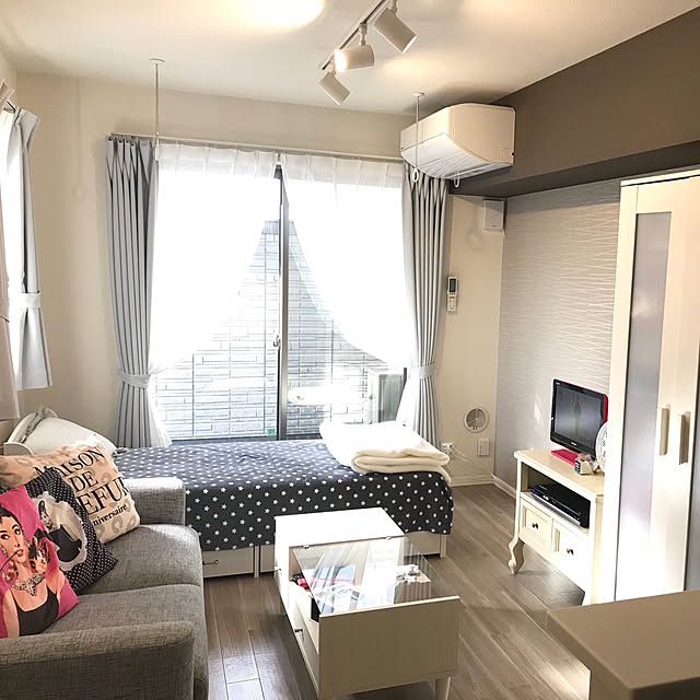 こちらのユーザーさんは、縦長のお部屋の左側にベッド、右側にデスク・テレビ・キャビネットを置いています。奥行きの狭めな家具が使われているので、広々したフロアが維持されていますね。カラーコーデは壁と床に合わせて、ホワイトとナチュラルをベースにしたそうです♪