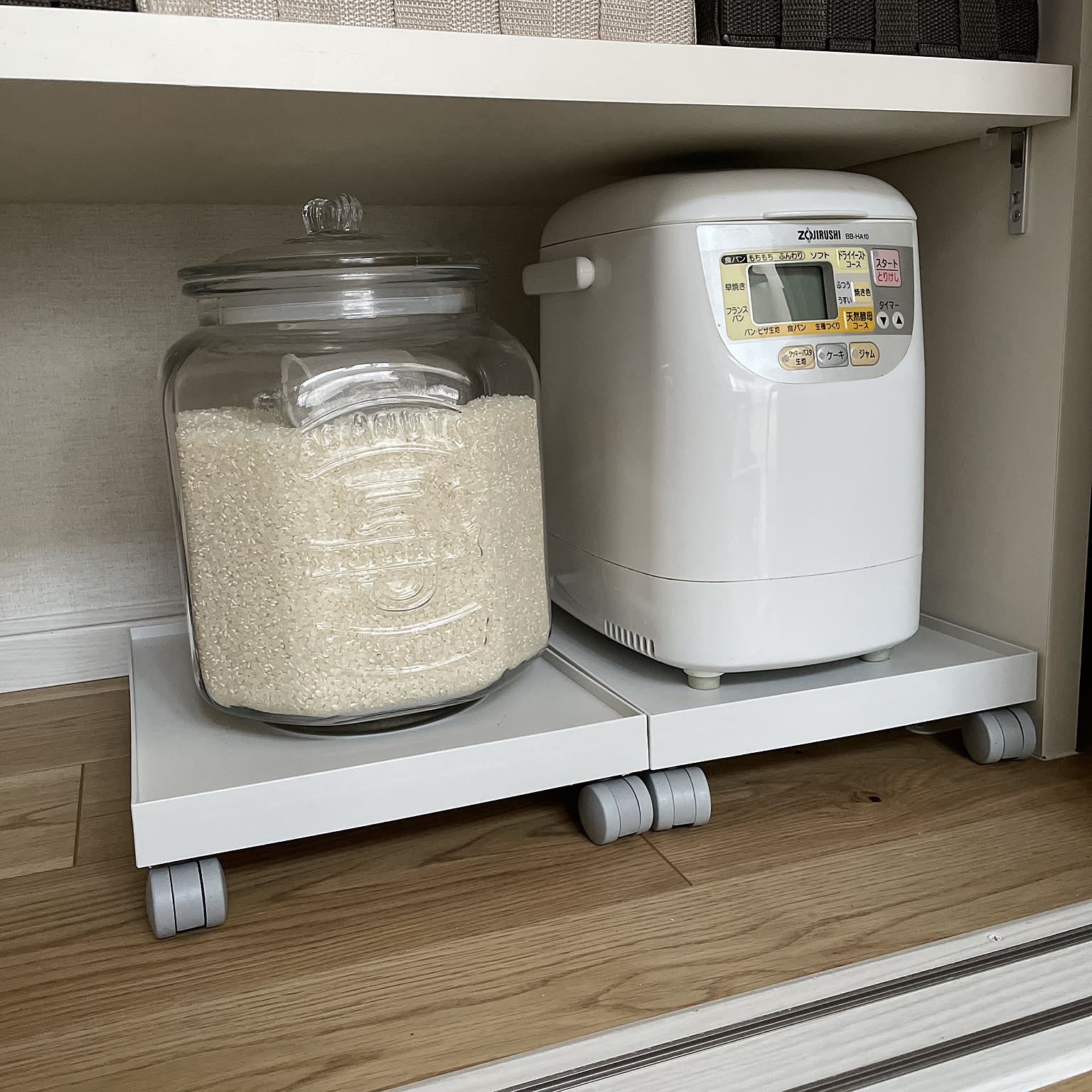 米びつとホームベーカリーを、奥行きのあるスペースに収納している、love_january24さん。無印良品のキャスターもつけられるフタに、専用のキャスターをセットして動く台にしています。重たいものや大きいものを収納するのに便利な、ナイスアイデアですね!