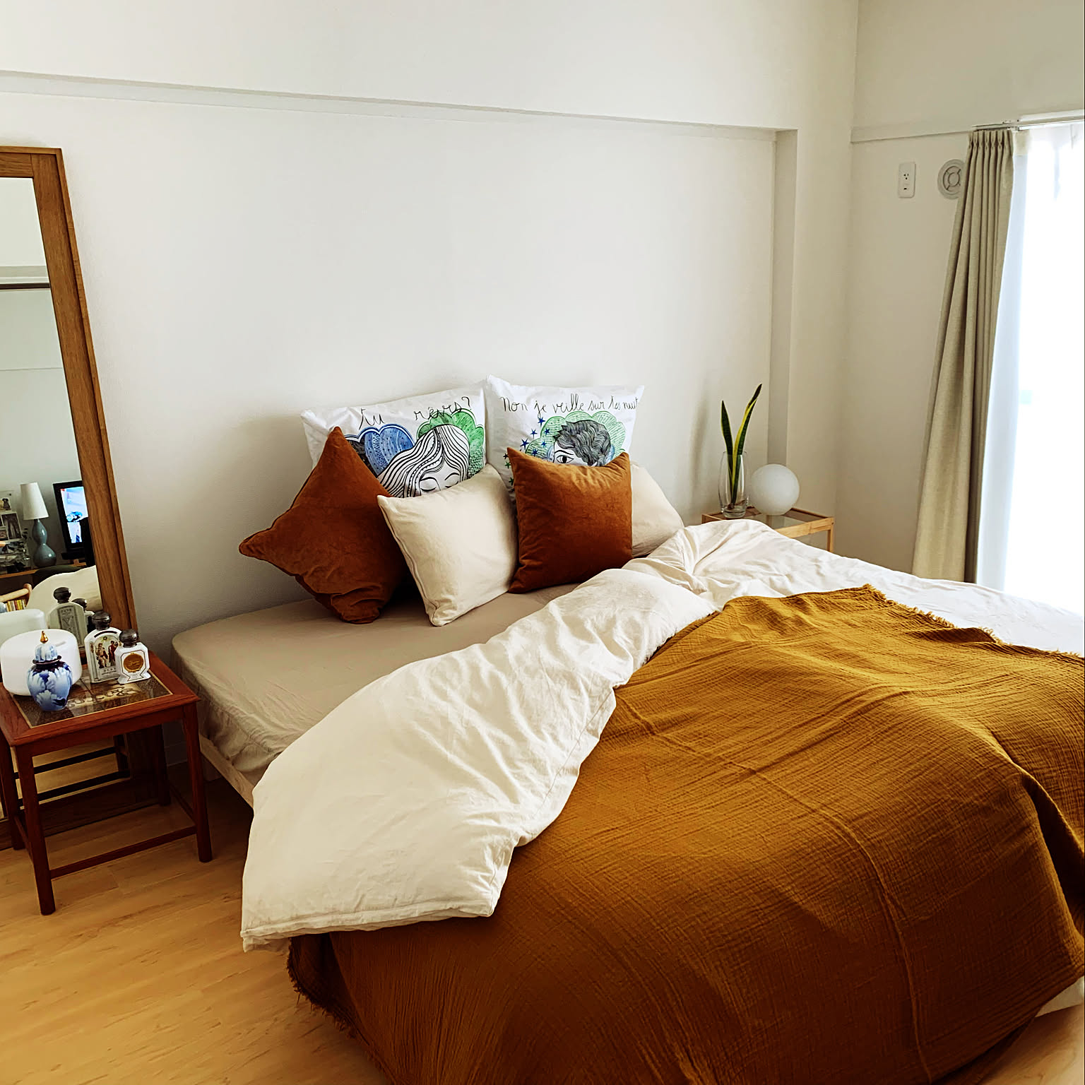 深いブラウンのベッドカバーとクッションが目を引くインテリア。家具とも色味が合わせてあり、ワンランクアップしたインテリアになっています。パッケージが素敵なコスメを置かれているのもいいですね。ベッドカバーは、おしゃれな寝室づくりにおススメのアイテムです。