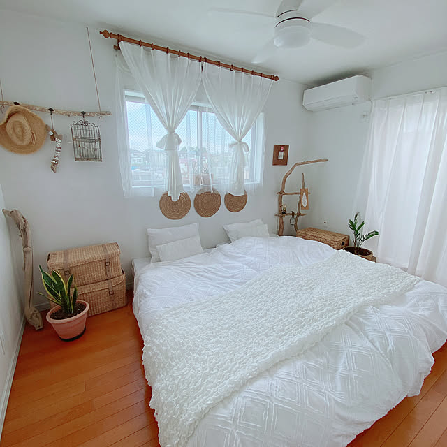 少しでも広く見えるようにと、白を基調にまとめられたこちらの寝室。カラーはホワイトでシンプルですが、毛布やベッドカバー、枕カバーを立体感のあるデザインにすることで、上質なインテリアになっています。ラタンや流木のアイテムの取り入れ方も、マネしたいポイントです。