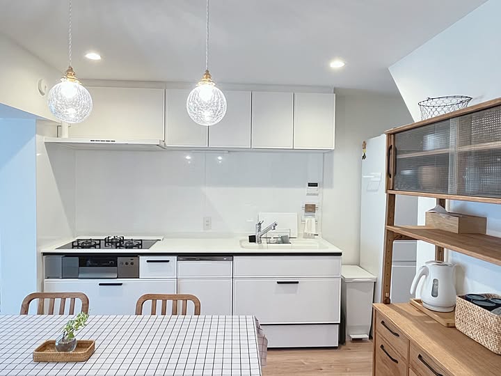 fuko55さん宅は、団地としては珍しいメゾネットタイプなんですよね。1階LDKは、空間を有意義に使える一体型。特に壁付けI型のキッチンはダイニングとシームレスに繋がっています。壁と同色系でコーディネートされていて、圧迫感も生活感も覚えさせないキッチンの佇まいが印象的。唯一、ダイニングセットとリンクするカップボードが、あたたかな家庭の気配をそっと漂わせているのがまた素敵です。