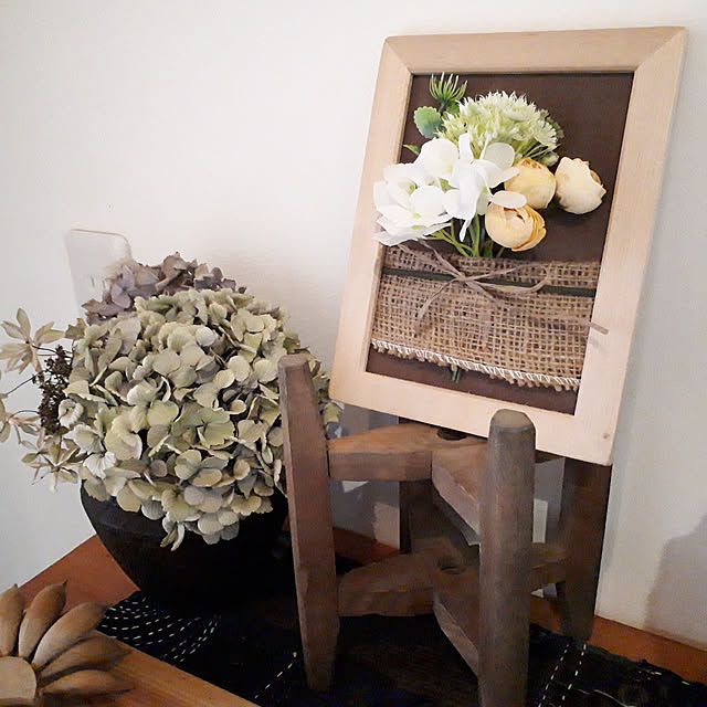 フラワーフレームアートが飾られているのは、kazuraさんのおうちです。シンプル&ナチュラルなデザインで、空間をやわらかな雰囲気に演出してくれています。ぱっと目をひくアレンジで、センスのよさがにじみでるコーナーになっています。