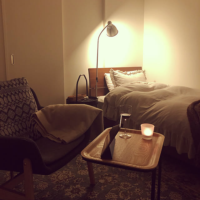 ベッドサイドに1人掛けチェアとサイドテーブルを設置し、タブレットで映画鑑賞を楽しんでいるという実例です。1人暮らしにはぴったりのコンパクトな映画鑑賞スペースができていますね。ナチュラルインテリアらしい癒しが感じられる空間で、ほっと一息つけそうです。