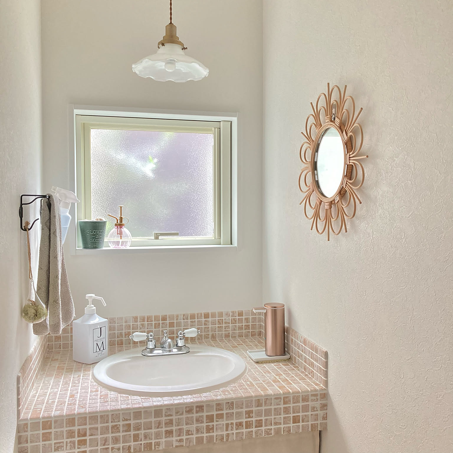 ナチュラルなarika_919さんの洗面所では、センサーポンプのローズゴールドをチョイスしていました。柔らかく華やかさがある色味なので、シャープになりすぎずまわりのテイストによく馴染んでいます。タイルとの統一感も抜群ですね。汚れ防止に、小さめなトレーを敷いて活用しているそうです。