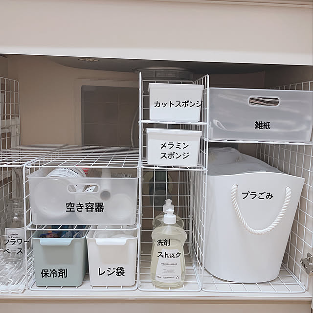 mayu_mさんは、ワイヤーネットを使ってシンク下に手作りラックを設置されました。アイテムごとにネットで仕切られ、何がどこにあるかわかりやすいですね。ワイヤーネットなら、配管も避けて作れるのでおすすめです。また、プラゴミを捨てるスペースも設けられていて、1つの動作でスムーズにゴミの片付けができます。
