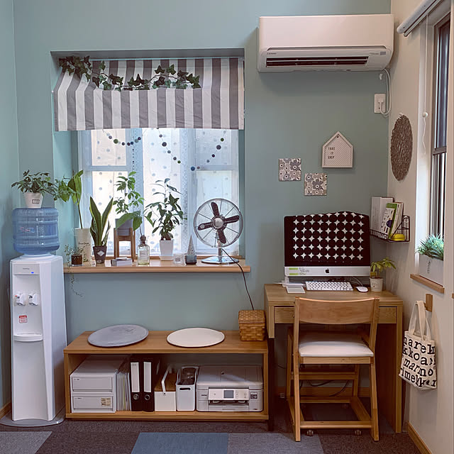 こちらのお部屋は、テーブルベンチを収納棚として取り入れています。ベンチの上はサーキュレーター置き場として使っていて、ちょうどよい高さです。お部屋全体で明るい色合いの木製家具でそろえて統一感があり、落ち着く空間ですね。