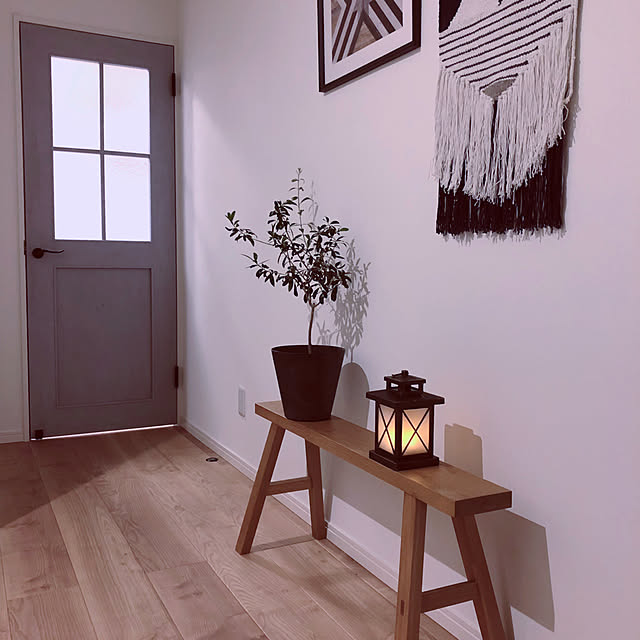 こちらのユーザーさんは、無垢材ベンチを玄関のディスプレイに活用されています。自然を感じさせてくれる無垢材が、やさしい雰囲気を作り出してくれます。ランタンのやわらかな光が、リラックス空間を演出してくれますね。