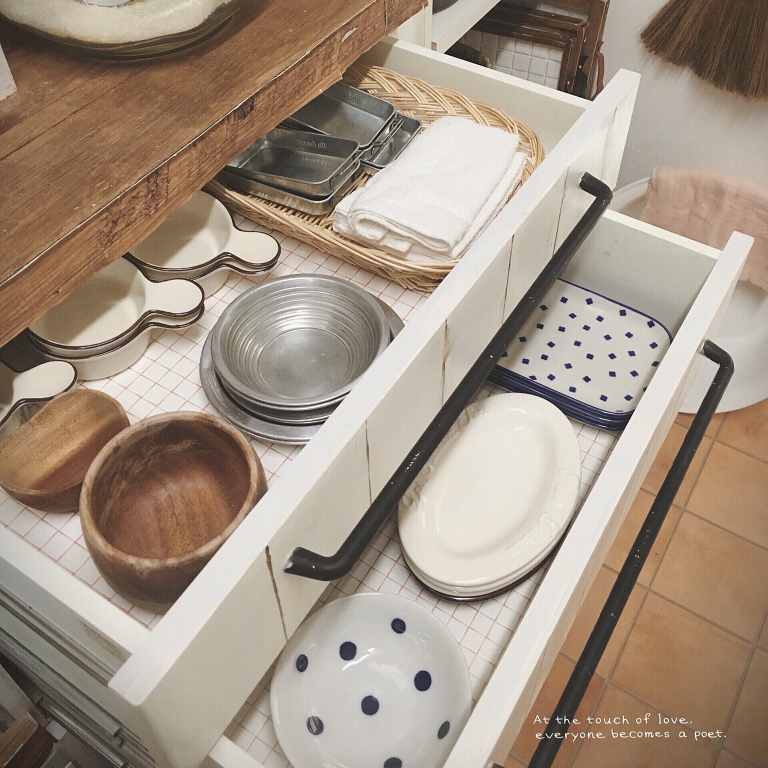 食器棚の引き出し部分に、繰り返し張り替えることのできる❝タイル柄の壁紙壁デコシート❞を貼り付けて、可愛くしいています。お皿選びを楽しむためのアイデアだそうで、とっても素敵です♡気分を上げてくれるシートを敷くことで、いつも綺麗な食器整理を心がけることができそうな、ユニークなアイデアです♪