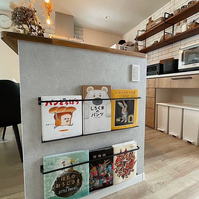 riri1989さんはキッチンにマガジンラックを設置し、絵本をディスプレイ収納しています。省スペースを有効活用した収納方法で、場所をとらず見た目もすっきりとした空間が完成していますね。出し入れしやすい位置にあり、お子さん自身で本を選ぶ楽しさも味わえ、自立心が自然と育まれていきそうです。
