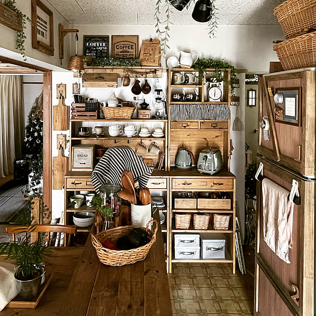 趣深いナチュラルアンティークなお部屋の実例です。たくさんのアイテムが並んでいますが、色味やテイストがそろっているので統一感がありますね。DIYが得意なBlueSkyOverTheCloudさんがコツコツ作り上げてきた理想の空間です。