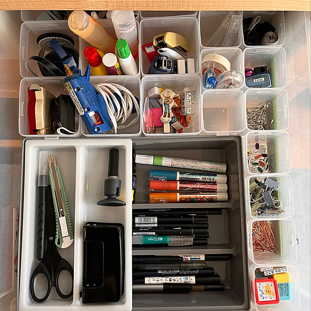 ユーザーさんたちに人気だったのは、100均の収納ケースに文房具を入れて、引き出しに収納する方法です。さまざまなタイプのケースがあるので、文房具の形状にあわせて選ぶことができますよ。どのような収納ケースを選んでいるのか、ぜひチェックしてみてください。