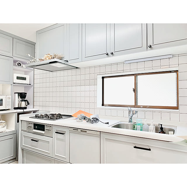 キッチンの壁面に100角タイルを貼ったという実例です。棚の色を白で統一した空間に、ホワイトのタイルがよく似合っていますね。窓からの光も合わせ、明るいキッチンを演出してくれています。これだけの広い面積をご自分で貼ったとのこと、スキルの高さに脱帽です。