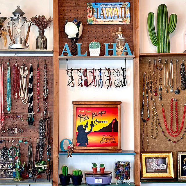 アクセサリーや眼鏡を、壁面にディスプレイ収納しているmaqfabさんの実例です。それぞれのデザインや色味も分かりやすいディスプレイ収納は、コーディネートもしやすそうですね。実例のように雑貨も一緒に飾ると、セレクトショップのようなハイセンスな空間に仕上がります。