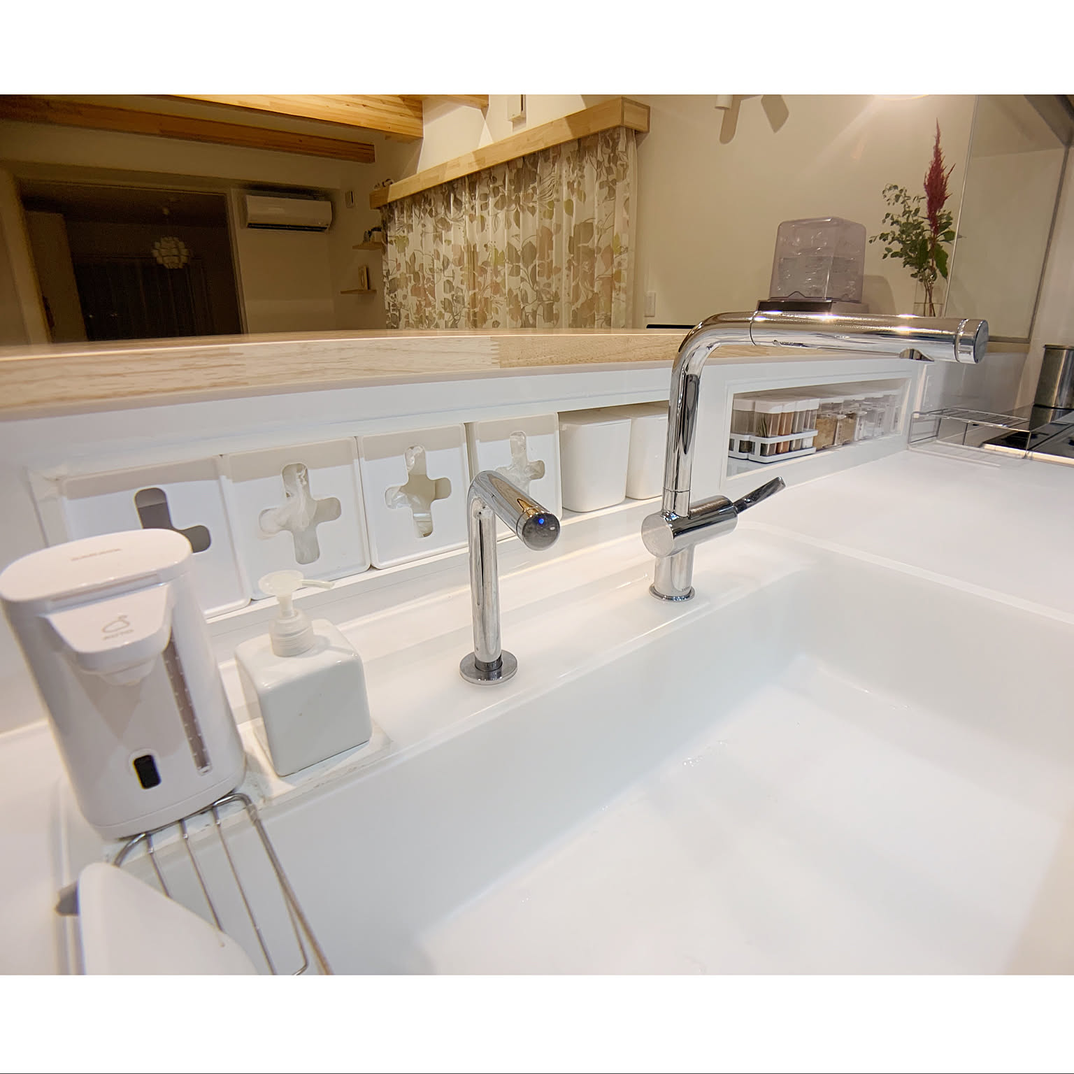 sachiさんは吊戸棚下にプルアウトボックスを設置しました。中には排水溝ネット、使い捨て手袋、ビニール袋を収納されているそう。面ファスナーを使っているので、補充のときは取り外すこともできます。デッドスペースを有効活用できるアイデアです。