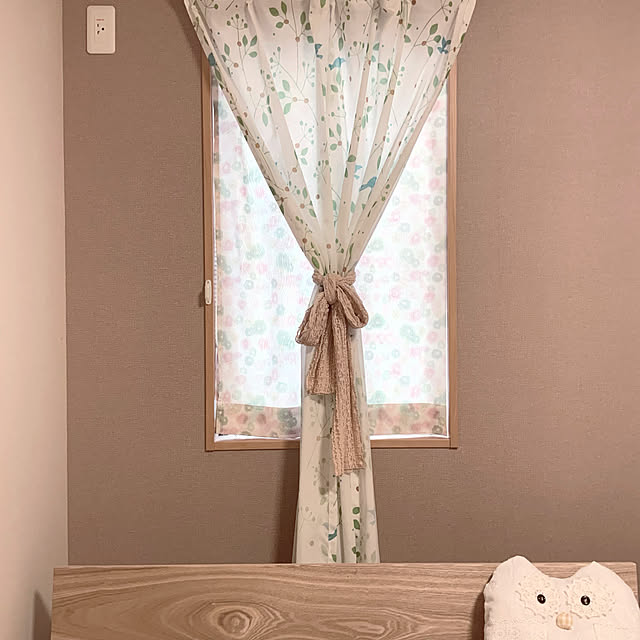 お部屋によっては、縦長の小さな窓があることも。サイズをきっちり合わせたカーテンにするのもよいですが、好みに合わせてひと工夫してみるのはいかがでしょうか。こちらのユーザーさんは、カフェカーテンとレースのカーテンを掛けて、ストールで縛っていましたよ。柔らかいカラーに癒されますね。