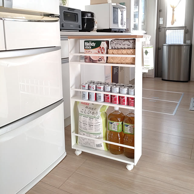 mayha.coo..さん宅では、キッチンの収納スペースが足りずに納戸に食品のストックを入れていたそう。towerのハンドル付きスリムワゴンを迎えて、納戸にしまっていたものを収納できるようになりました。スリムながら収納力があり、狭い隙間を有効活用できるのはうれしい限りですね。