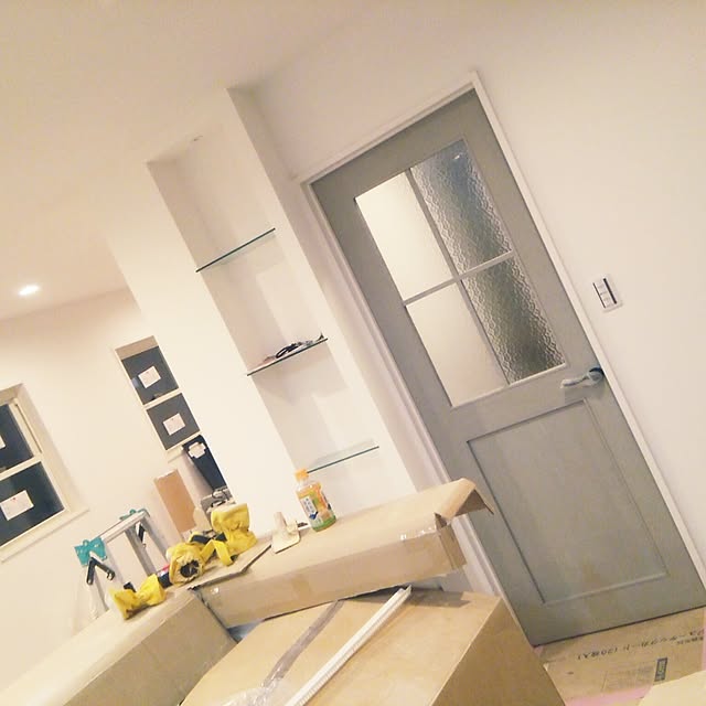 makimakiさんがリフォーム中の明るく広々とした空間に変貌したお部屋。ラシッサDフローリングの清潔感溢れるホワイトカラーが、空間を一層拡張させています。LIXILのドアとフロアの調和が、洗練されたカフェ風のインテリアを演出していて心地良いですね。