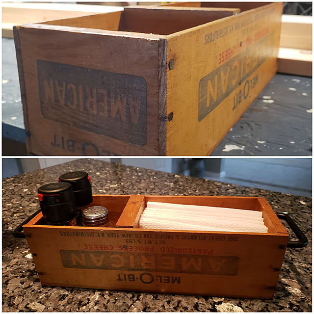 木箱を使って、塩と胡椒、そしてキッチンペーパーを収納している、ma-san01さんの実例です。まるで、レストランのテーブルに置いてありそうな収納で、見栄えもいいですね。取っ手もついており、持ち運びもしやすそうです。