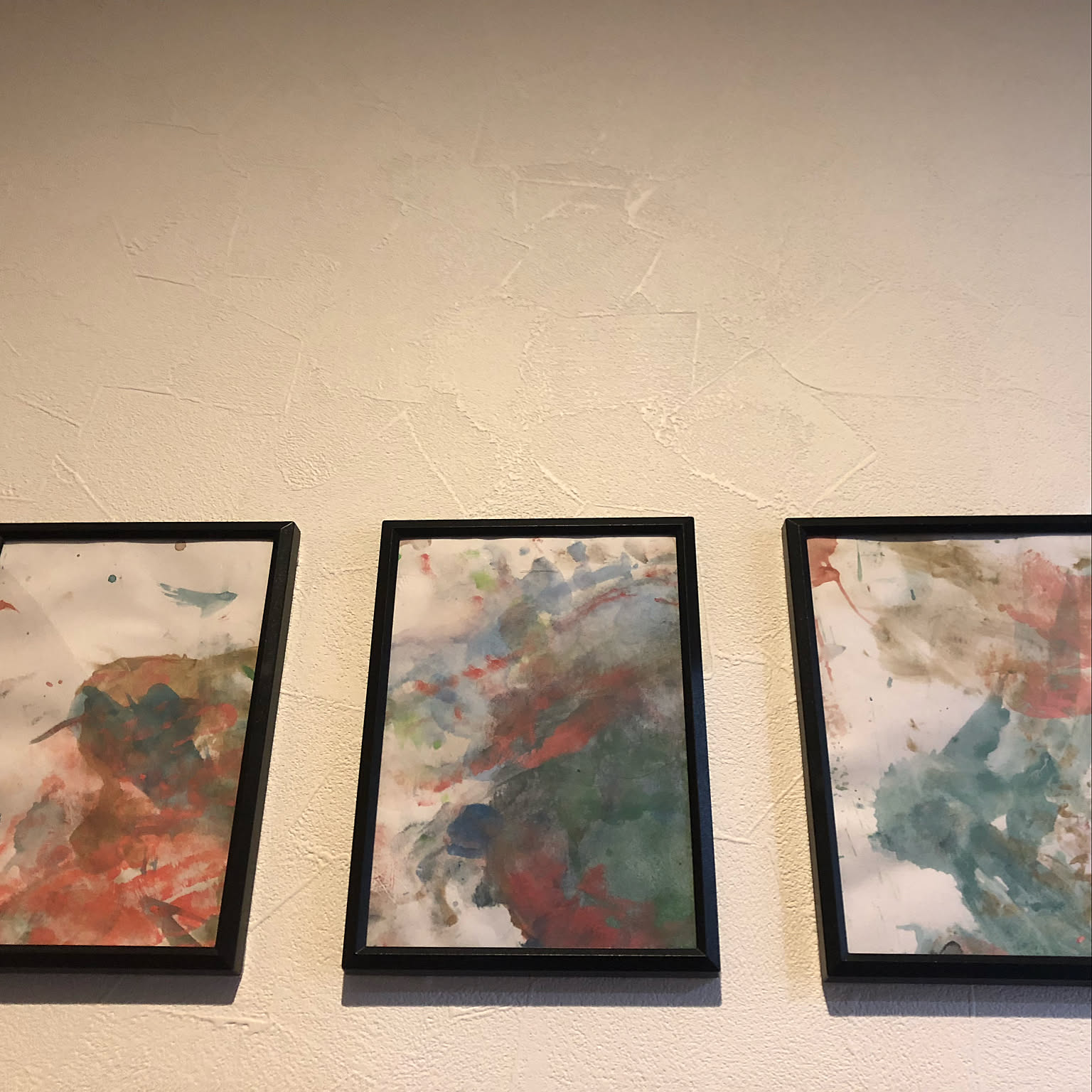 1歳になるお子さんが水彩絵の具を使って描いたというpiiicooooさんの実例です。大胆な色使い、筆使いに魅了されますね。元々一枚の大きな紙に描かれていた作品を三等分し、額縁に入れてお部屋に飾られています。見るたびに幸せな気持ちになるアートでお部屋を彩るアイデアは、素敵ですね。