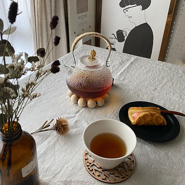 ガラスポットの下に敷いているのは、ウッドボールと取手がかわいい鍋敷き♡