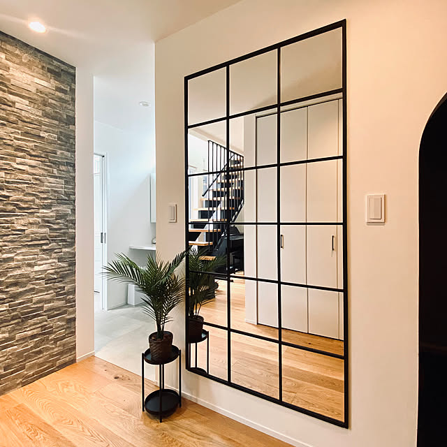 RoomClip運営チームが選んだのは、k-k-mamaさんの投稿です。モダンな雰囲気が素敵なk-k-mamaさんのインテリア。玄関先の開放的なミラーは、IKEAで購入したものを格子鏡にDIYされたそう。洗練されたアイデアと、壁面を生かす圧巻の作品に見惚れてしまいました!ミラーの取り入れ方次第で、こんなにも空間に抜け感が生まれるのですね。ブラックの格子柄が引き締め役となる、素敵なインテリアを参考にしたくなりました。
