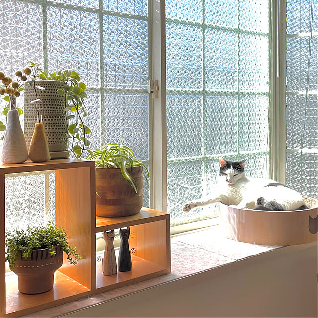 nobikoさんは出窓に、セリアの窓ガラス用目隠しシートを貼られています。ブラインドを下げなくてよくなったとのことで、しっかり外の光を通しながら目隠しできるのがいいですね。レトロガラス風のデザインも素敵で、窓辺が華やぎます。
