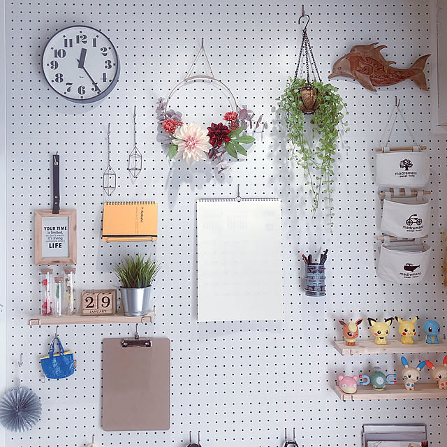 こちらの実例では、有孔ボードを使って雑貨をディスプレイされています。造花に合わせて右の方に飾られているのは収納ケース。こまごましたものを入れるのに便利そうですね。ノートなどの文具も見栄えばっちりに収納できています。