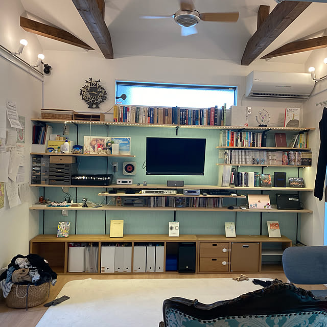 お店で購入できる壁面ラックやウォールシェルフなどを使って、壁面を大きな収納に仕上げているユーザーさんもいました。中にボックスなどを入れてすっきりまとめたり、大容量の本棚を実現したり、壁面の使い方もさまざまですよ。