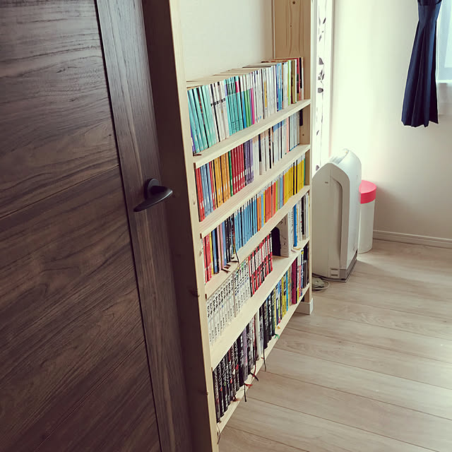 こちらの実例では、ドア横の壁面に本棚をDIYしたそうです。手持ちの本をすべて収納できるしっかりした容量の本棚で、背表紙のずらっと並んだ様子が気持ちいいですね。文庫本がすっきり収まる厚みになっていて、省スペースな収納に仕上がっています。