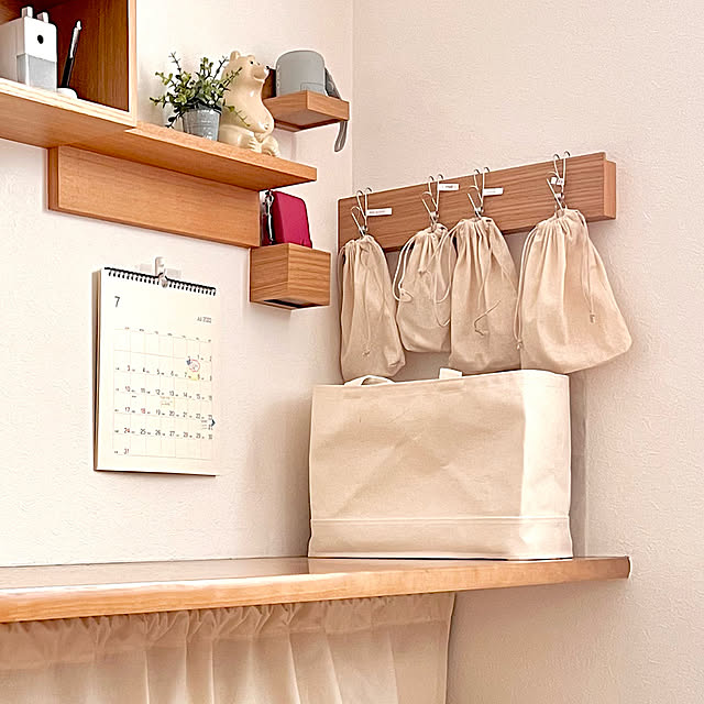 袋やバッグ類は、おうちの収納としても活躍してくれるアイテムです。軽くてフックにも吊るしやすいので、壁面収納に取り入れるのにも相性がいいですね。まずは、袋に入れて収納するアイデアについてユーザーさん実例をご紹介します。
