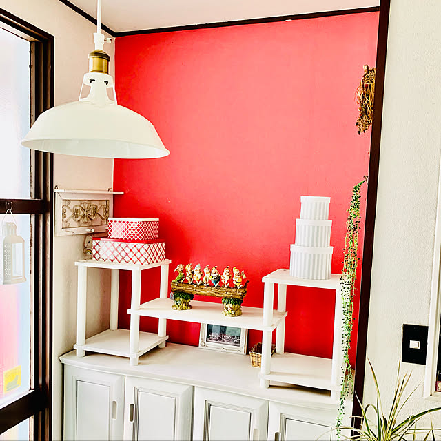 brownyさんの玄関の赤い壁紙に映える、真っ白なペンダントライト。ポップでかわいらしいインテリアは、まるでカフェの入口のようですね。こちらはホーロー製なので、埃をふき取るだけでお手入れも簡単です。