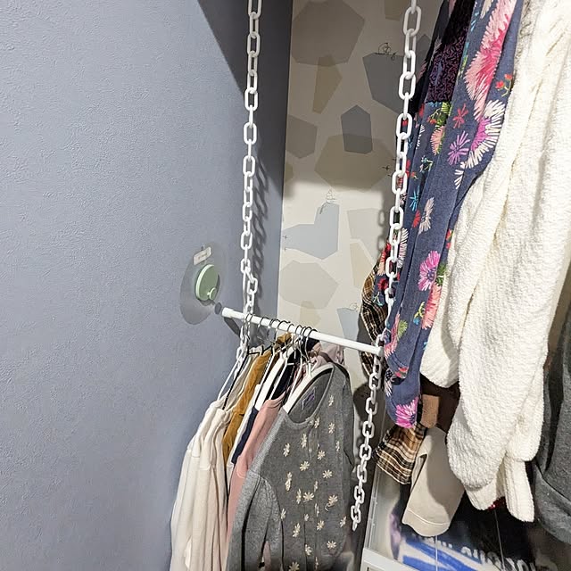 【yamamaさんのコメント】こどもにぴったりなブランコハンガー。Seria商品のプラスチックチェーン×2つ、S字フック4つ入り、突っ張り棒 ¥440で出来る♪幼稚園くらいのお子さんにおすすめです。下の段によく着る衣類、上の段に季節外の衣類を掛ける収納に!衣替えは上下入れ替えるだけで簡単。