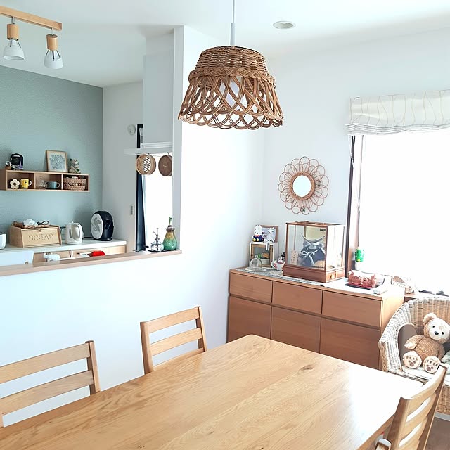 ホワイトとブラウンを基調としたダイニングで、MOMO NATURALの照明を使用されているm.m.mさん。アラログという天然素材を編み込んだ、軽やかであたたかなデザインが、ダイニングにピッタリですね。編み目の隙間からの光や、影も楽しめそうな逸品です。木の家具と同様に、長く大切にしたいアイテムですね。