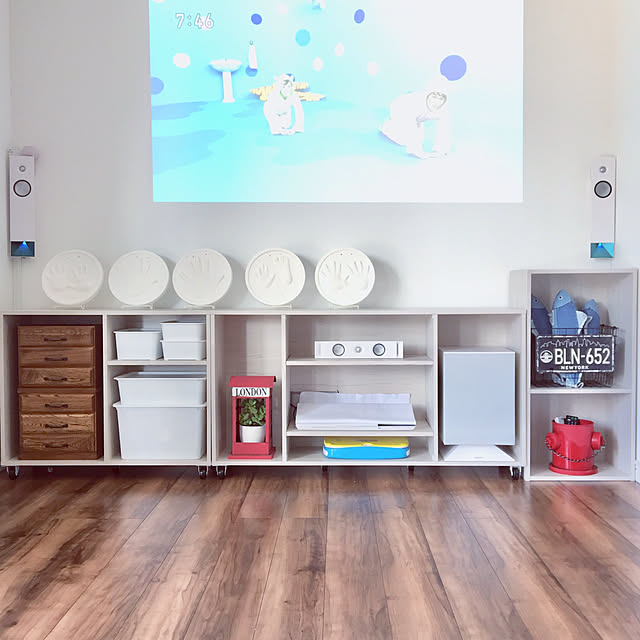 ボックスを組み合わせてリビングのおもちゃやご家族の身支度コーナーを作ったkanaさん。収納するものによって棚の高さを調節して、スペースを有効に活用されています。ホワイト系の色味が圧迫感を感じさせず、インテリアによく馴染んでいますね。