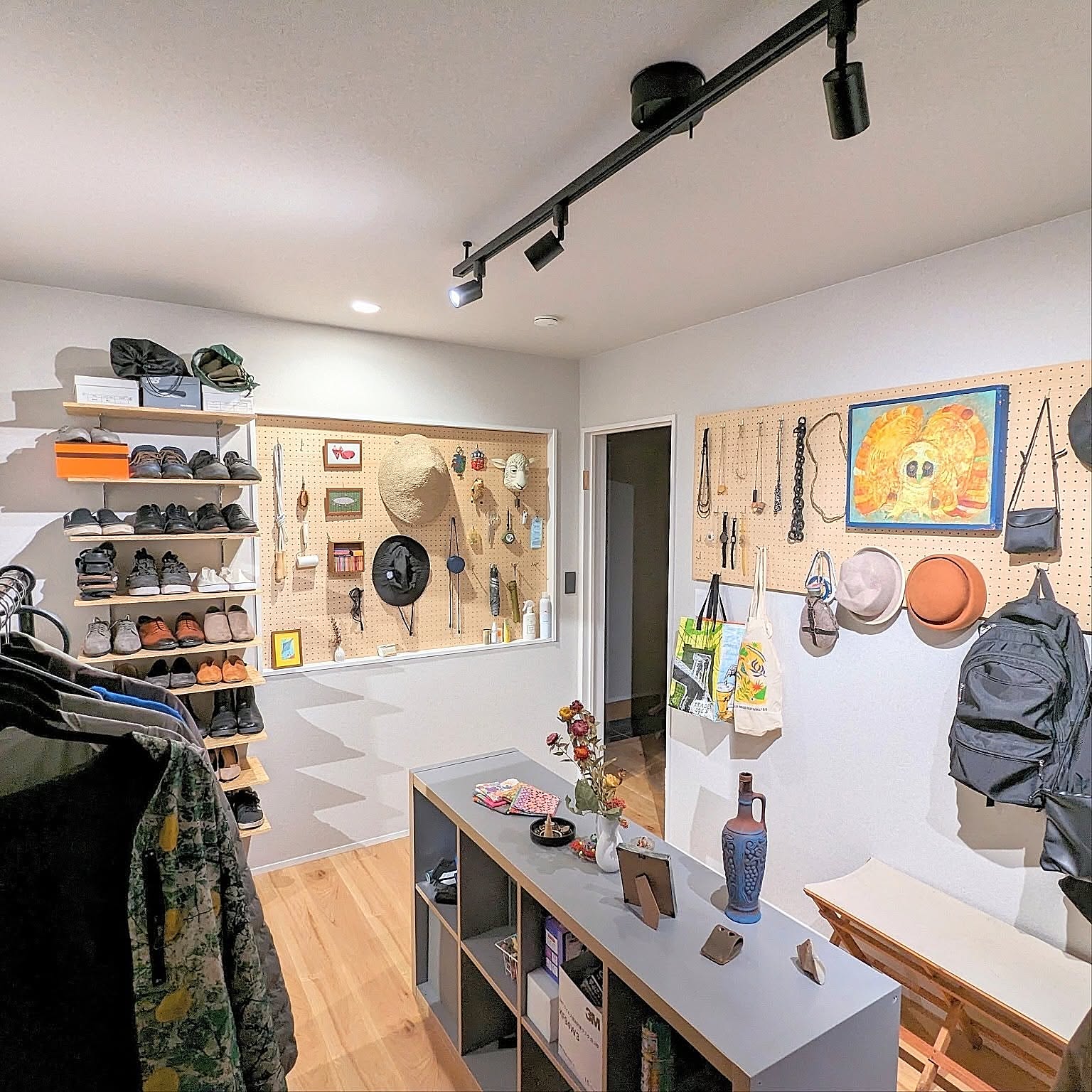_222222さんは、玄関すぐそばのお部屋をシューズクロークとして使っています。パンチングボードや可動棚を用いてお部屋の壁一面を収納に活かせるように工夫。見やすくワクワクするような収納は古着屋さんをイメージしたものだそうで、毎日の身支度が楽しくなりそうですね。