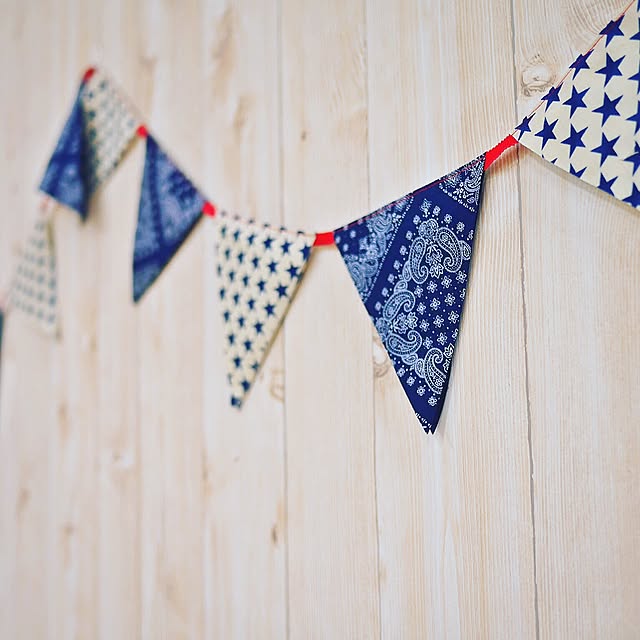 壁面を楽しげに彩っているのは、バンダナなどの生地を使って作られたガーランドです。yukawoさんは、紐に赤いリボンを選びました。ちらりと見える赤が良いアクセントになっていますね。ガーランドの布は切りっぱなしにしたとのこと。手軽に作れるのも魅力です。