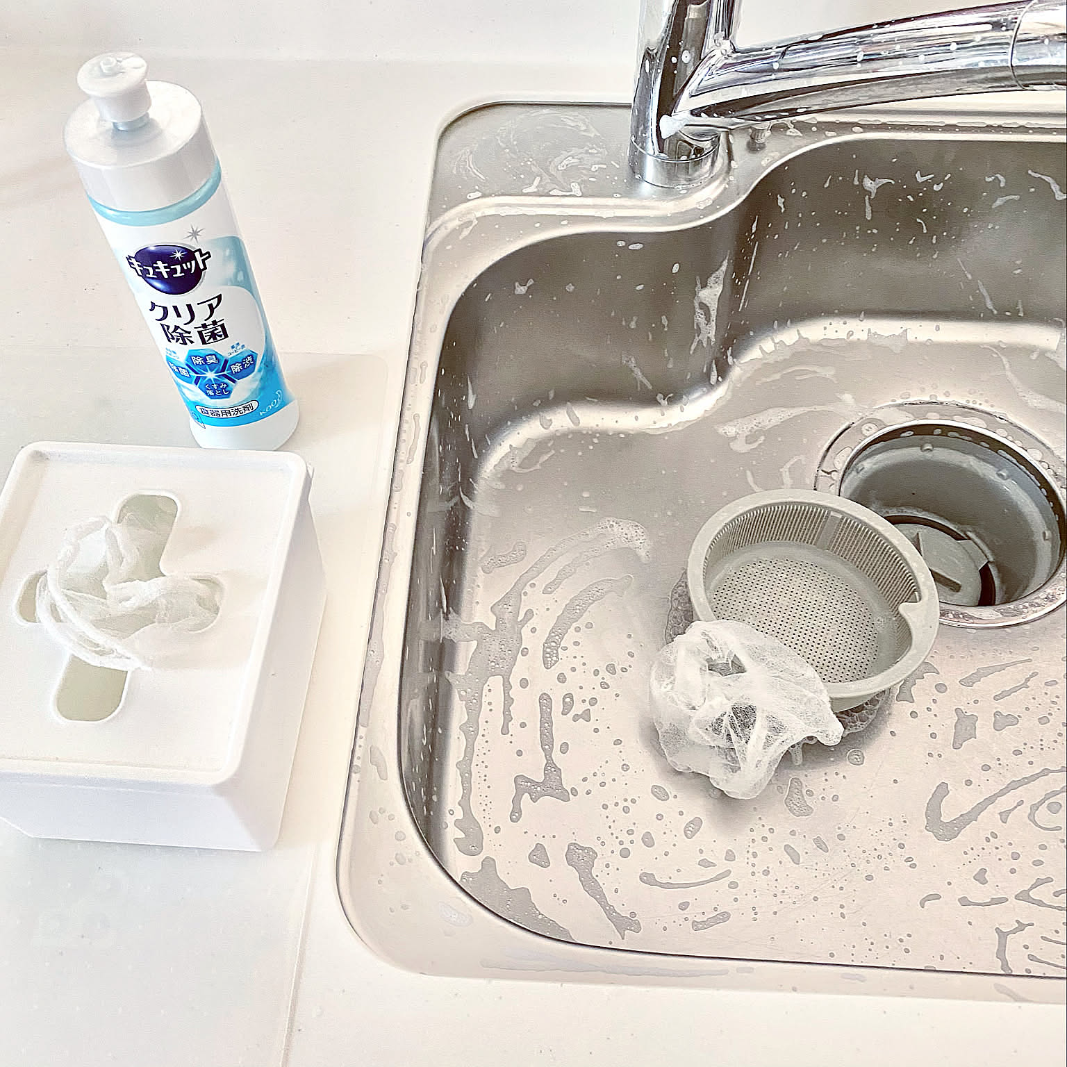 sasaeriさんがやめたのは、キッチンシンク専用のスポンジを置くこと。代わりに水切りネットを活用しています。新しい水切りネットでお掃除をした後、ゴミ受けにそのままセット。ストッキングタイプのネットは泡立ちがよく細かいところまで磨けるそうですよ。シンクまわりもすっきりする効率的な使い方です。